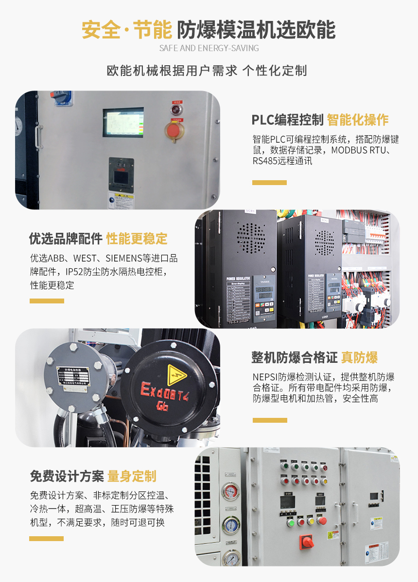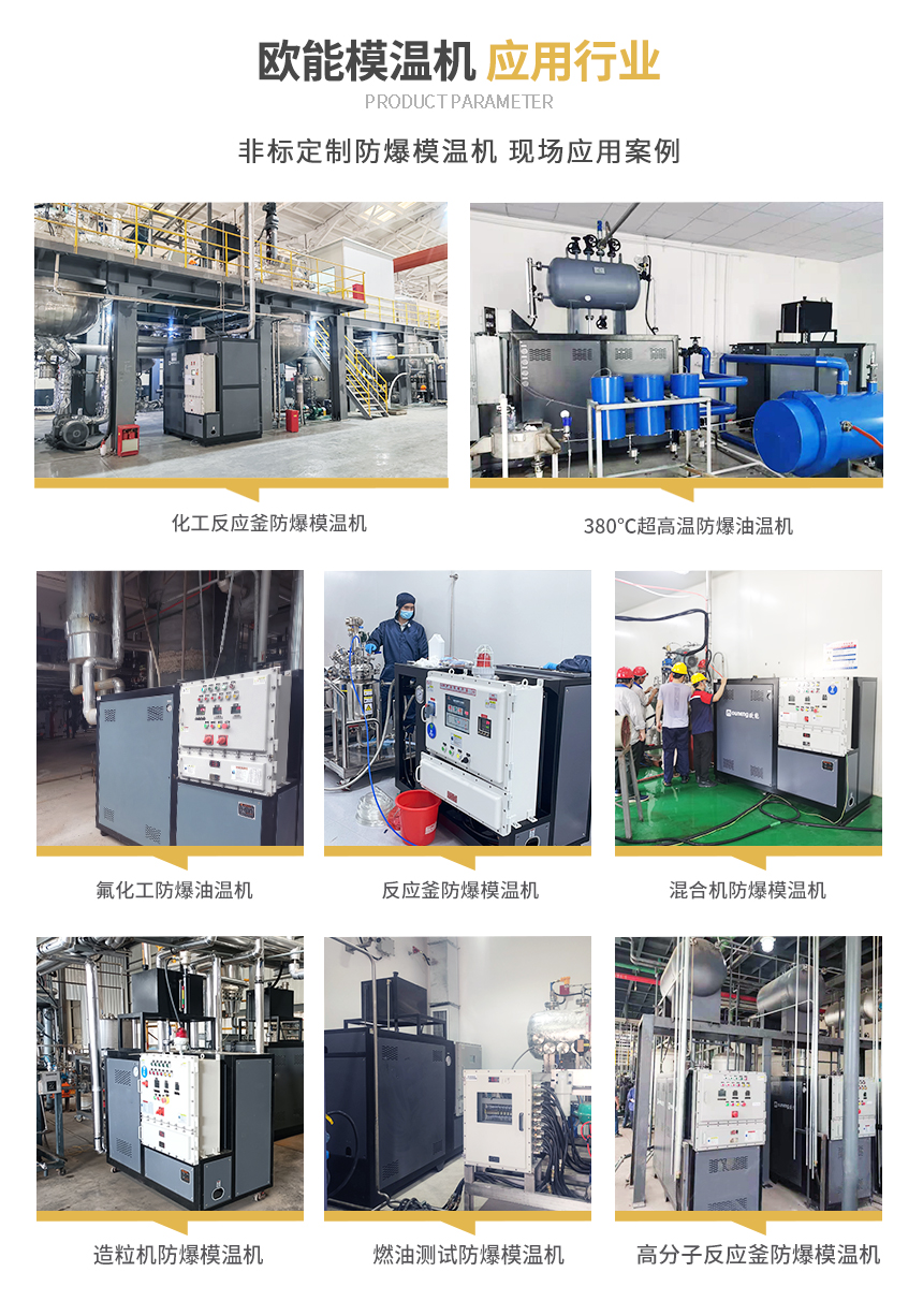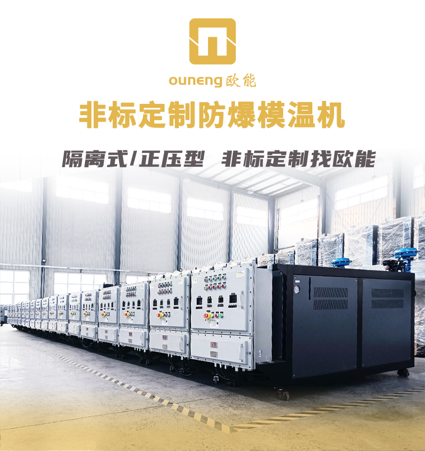 防爆油溫機(jī)主要應(yīng)用在易燃易爆等特種場所,經(jīng)??赡苄孤痘蛞缟⒊龈鞣N各樣的易燃易爆氣體、液體和各種粉塵及纖維。防爆油溫機(jī)根據(jù)使用場合的特性及安全要求的,不同選擇不同的防爆級別,防爆油溫機(jī)各組件均按國家防爆標(biāo)準(zhǔn)制造,歐能機(jī)械可按客戶要求定做防爆油溫機(jī)。